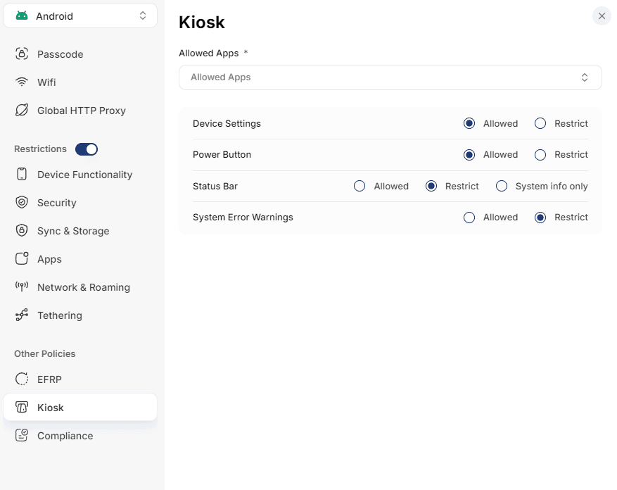 Allowed Apps (Multiple) – Can be allowed or restricted.