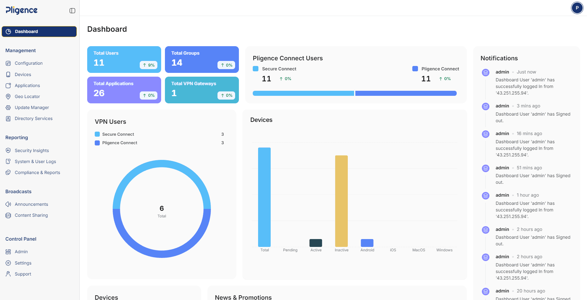 The Dashboard enables you to monitor key metrics such as total users, groups, applications, VPN gateways, VPN users (either Secure Connect or Pligence Connect), and devices (Secure Connect, BYOD, or Fully Managed). Additionally, you receive notifications on user activities, including:
